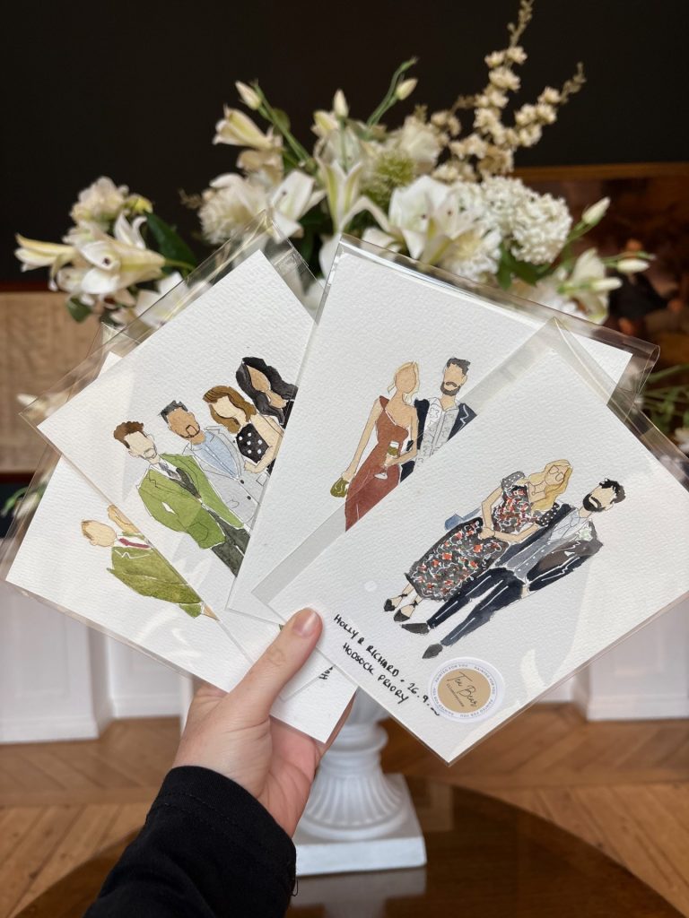 Tea Bear Illustrations provide live guest illustration on your wedding day. I’m Sarah – a pencil and watercolour artist. I take a quick snap of your guests and while they enjoy celebrating with you, I line up their freehand painted sketch that they can take home at the end of the night. These are a personalised and unique reminder of your day.